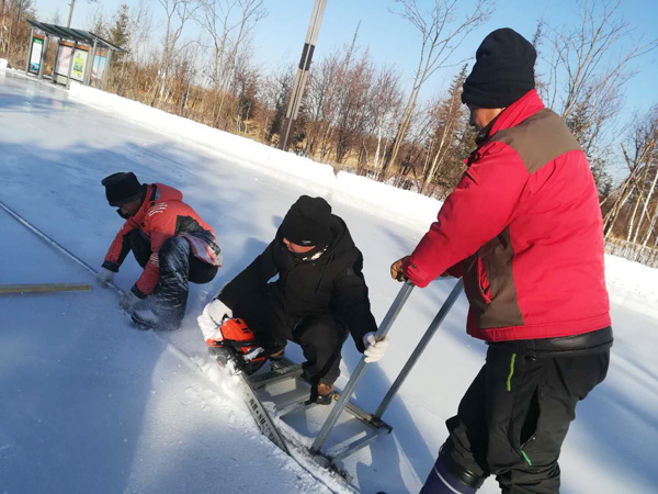 為保障工期質(zhì)量,運營一線抽調(diào)了由后勤、檢修等部門20余人組成的項目施工小組,連續(xù)20日,每日從早7:00到晚22:00全員加班加點,甚至通宵達旦,克服了人力不足、經(jīng)驗欠缺、沒有專業(yè)設備等重重困難,員工們?nèi)找岳^夜灑水造冰、造雪做雕,自主研制磨冰機、改裝切冰儀、造雪機水箱、雪墻磨具、象棋磨具等設備。因工程需到湖中取冰,在切割冰塊過程中,冰冷的水花濺滿了員工的鞋和衣服,零下20度的氣溫下,寒風掃過立刻被凍成“冰人”,個別員工腳和臉部被凍傷,但大家無一人抱怨、無一絲退縮,披星戴月,咬緊牙關,高質(zhì)量如期完成了長白山大街“冰光大道”全程500米、1.5公里人行雪道、300余個雪人及彩燈亮化等工作任務,達到了“少投入,多產(chǎn)出,控規(guī)模,重效果”的“粉雪節(jié)”活動初衷。施工期間,公司機關黨支部每日到工地為員工送熱姜湯和茶蛋等食物,慰問一線員工,緩解作業(yè)疲勞,讓員工們感受到了企業(yè)“一家親”的濃厚氛圍。