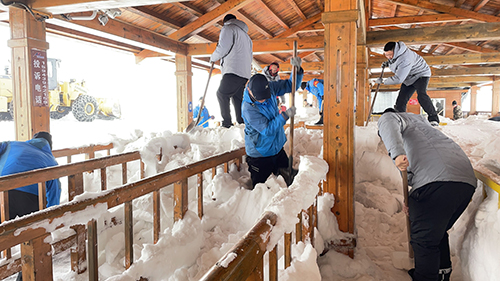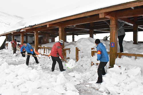 長(zhǎng)白山冬季漫長(zhǎng),雪量極大,西景區(qū)各候車回廊經(jīng)過(guò)一冬天風(fēng)雪“洗禮”,積雪已超過(guò)一人多高。為迎接“五一”小長(zhǎng)假,確保旅游安全有序,景區(qū)運(yùn)營(yíng)三部抽調(diào)經(jīng)理級(jí)管理人員、調(diào)度員、駕駛員共計(jì)20余人,組建清雪專班。專班人員分工協(xié)作,一組負(fù)責(zé)拴好安全繩推落棚頂積雪,另一組一鍬鍬鏟除積雪,汗珠常常掛滿額頭,濕透棉衣。隊(duì)員們起早貪黑、加足干勁、就地進(jìn)餐,他們既承擔(dān)起高強(qiáng)度作業(yè),又承受著積雪反射紫外線對(duì)皮膚造成的傷害,經(jīng)過(guò)一周“浴雪奮戰(zhàn)”,王池、峽谷、換乘和主峰等景點(diǎn)候車回廊積雪已全部清理完畢。