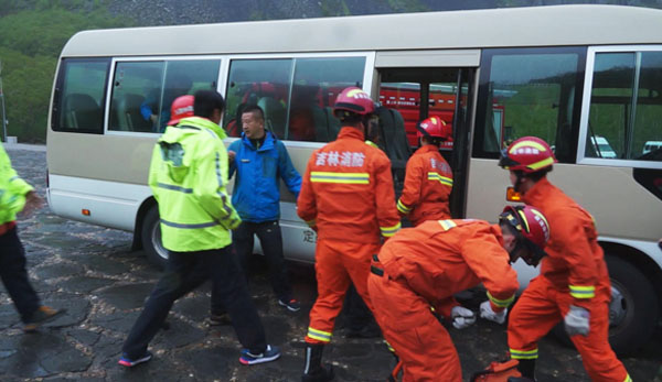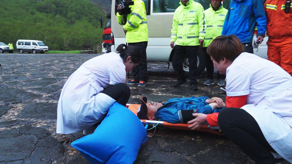 第二個場景,模擬山體崩塌,滾石砸中一輛運載20名乘客的中巴車車門,造成車門損壞無法開啟,1名游客因受到驚嚇心臟病發作。應急預案啟動后,駕駛員立即使用對講機向上級報告,瀑布工作人員立即趕到車輛附近,協助駕駛員打開駕駛室車門,車內游客迅速下車離開危險地帶。隨后,長白山消防支隊、景區醫護人員先后趕到現場,消防員們使用工具破門解救,醫護人員現場急救心臟病游客,隨后被長白山中心醫院120急救車送往醫院。與此同時,調度應急救援隊將車輛推離危險區域;檢修車輛牽引事故車輛離開危險區域。
