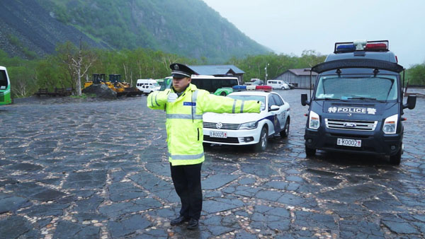 第三個場景模擬持續降雨,瀑布發生泥石流,由于天池、瀑布景點同時不具備開放條件,北景區關閉,啟動游客退票應急預案:在二道白河區域發布景區封閉告知;協調公安交警部門在望云橋處對過往旅游車輛進行景點封閉提示;在以上告知程序啟動的同時,退票工作也有序進行。