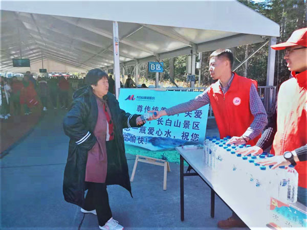 志愿服務隊員們天不亮就進入北景區,分別在山門和換乘中心設立“黨員先鋒崗咨詢臺”,為游客們提供義務咨詢,并為老年和兒童們免費發放了盛滿愛心的礦泉水,切實地幫助游客解決了許多問題,充分展現長白山的服務理念和宗旨,也快速的與游客間搭建起了“友誼之橋”,受到了廣大游客的普遍贊譽。