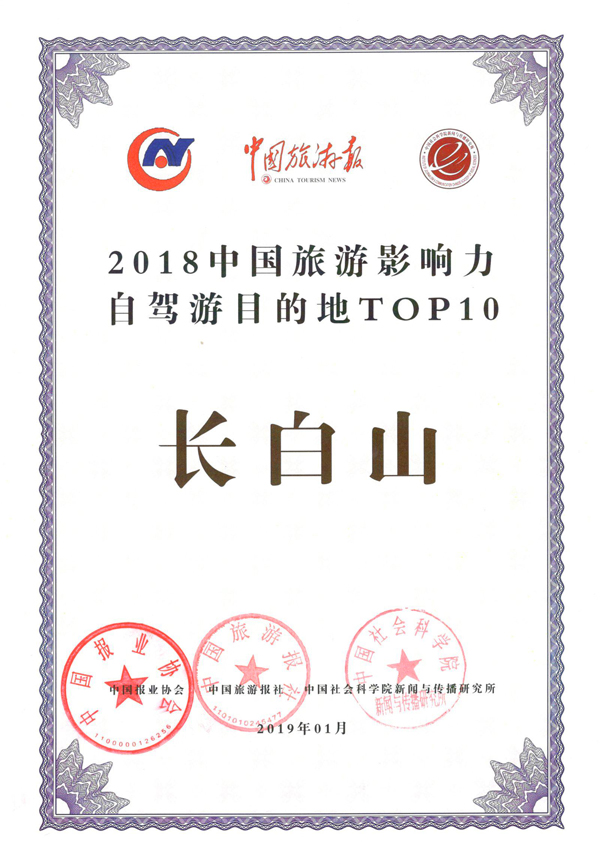 經文化和旅游部批準,由中國報業協會指導、中國旅游報社主辦、中國社會科學院新聞與傳播研究所學術支持的“2019中國旅游產業年會”于2019年1月23日在北京亮馬河會議中心舉行,長白山被授予2018中國旅游影響力自駕游目的地TOP10。