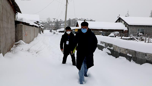 2月17日,長(zhǎng)白山地區(qū)迎來了入冬以來規(guī)模最大的一場(chǎng)大雪,這為第二天的排查工作增添了不小困難。清早,雪花還沒有停止,漫天白雪里,我們依然聽到了“咯吱咯吱”的踩雪聲,原來股份公司的志愿者一早就已經(jīng)趟著膝蓋深的積雪,來到指定區(qū)域進(jìn)行入戶排查登記。天寒地凍、大雪紛飛,雪水濕透了襪子,寒風(fēng)刺痛著臉頰,也不能阻擋股份人和全區(qū)人民一道戰(zhàn)勝疫情的信念和決心。